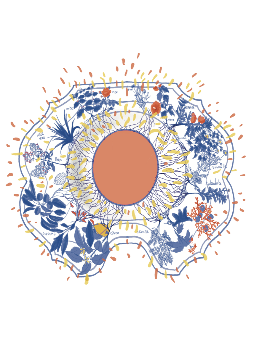 Dans le bac à shampoing de Pamela, l'odeur des cheveux mouillés développent leurs arômes, accompagnés d'une variété de parfums issus d'un herbier de toutes les provenances. Ce bac de lavage fabriqué par Jean-Sébastien avec l'aide de la céramiste Marie Lac réuni les diférentes espèces végétales que l'on retrouve dans les produits qu'utilise Pamela.